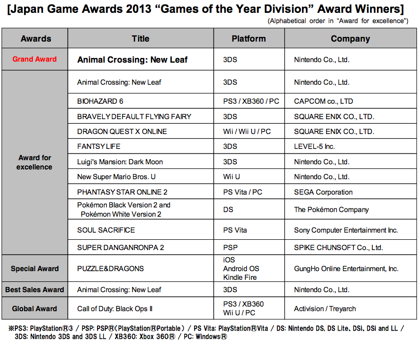 สมาคมผู้ผลิตสื่อบันเทิงและคอมพิวเตอร์ของญี่ปุ่น CESA ซึ่งมี Shin Unozawa เป็นประธาน ได้จัดพิธีมอบรางวัล “Japan Game Awards” ให้กับเกมที่เข้าชิงสาขาต่างๆในหัวข้อ Games of the Year Division ซึ่งมีทั้งสาขา Grand Award, Award for excellence, Special Award, Best Sales Award และ Global Award ภายในงาน Tokyo Game Show 2013 ณ หอแสดงสินค้านานาชาติ Makuhari Messe ฮอลล์ 8