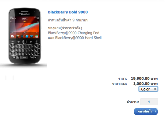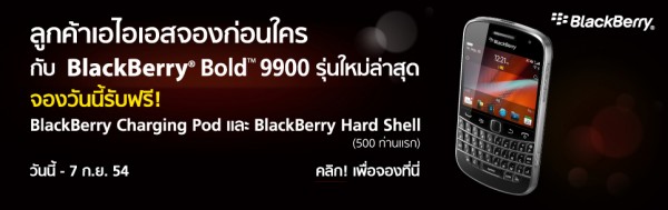 พิเศษสุดๆ 500 ท่านแรก ที่สั่งจอง BlackBerry Bold 9900 รับฟรี! BlackBerry Charging Pod และ BlackBerry Hard Shell (มูลค่ารวม 2,500 บาท) สอบถามรายละเอียดเพิ่มเติม เอไอเอส คอลล์เซ็นเตอร์ 1175