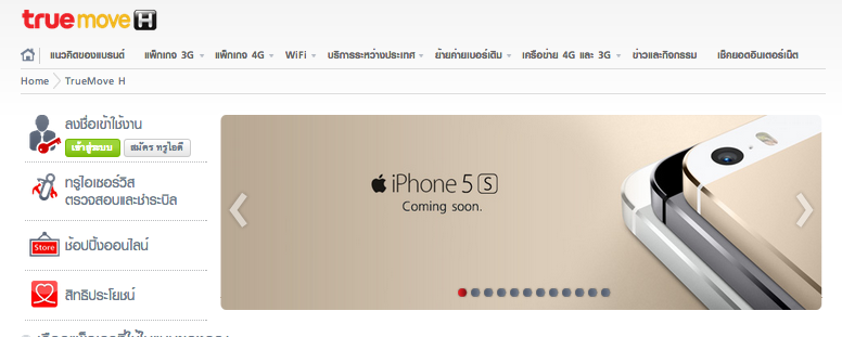 ทันทีที่ Apple ได้ประกาศทางการว่าเตรียมจำหน่าย iPhone 5s และ iPhone 5c ในอีกหลายประเทศวันที่ 25 ตุลาคมนี้รวมถึงประเทศไทยด้วย ดูเหมือนทั้ง 3 ค่ายในบ้านเราต่างเตรียมความพร้อมกันเต็มที่ แต่ค่ายแรกที่ออกตัวก่อนเพื่อนนั่นคือ Truemove H ที่ได้นำเอาแบนเนอร์ Coming Soon ของทั้ง iPhone 5s และ iPhone 5c ขึ้นเว็บไซต์เป็นที่เรียบร้อย โดนเน้น iPhone 5s ไปที่สีทอง และ iPhone 5c ไปที่สีน้ำเงิน