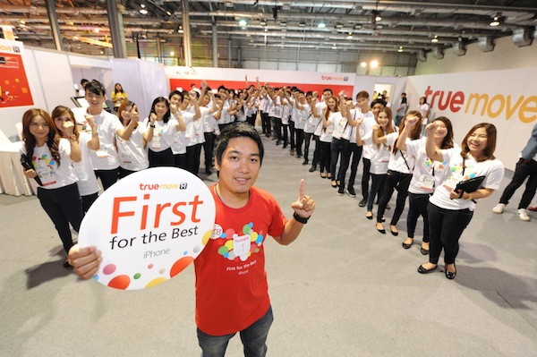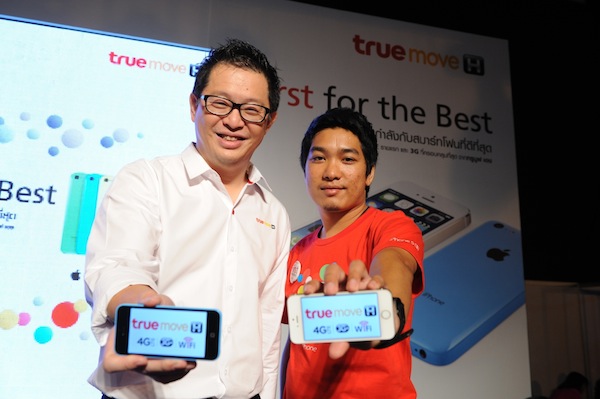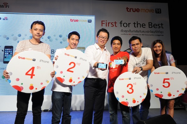 ทรูมูฟ เอช โดย ดร.ปพนธ์ รัตนชัยกานนท์ (กลาง) หัวหน้าคณะผู้บริหารกลุ่มด้านการพาณิชย์ กลยุทธ์การขายและรีเทล / ทรูไลฟ์สไตล์รีเทล บมจ. ทรู คอร์ปอเรชั่น ส่งมอบ iPhone 5s และ iPhone 5c จำนวน 5 เครื่องแรกในไทยให้กับลูกค้าที่ pre-order ไว้ล่วงหน้า พร้อมร่วมเค้าท์ดาวน์ฉลองการเปิดตัวอย่างเป็นทางการ ณ สกาย ฮอลล์ ชั้น 3 เซ็นทรัล พลาซา ลาดพร้าว โดยลูกค้าทั้ง 5 ท่านนี้จะได้รับของรางวัล พรีเมียม สุดพิเศษ หูฟัง DR. DRE HEADPHONE BEAT MIXR และ กระเป๋าเป้ RED POWERFUL จากทรูมูฟ เอช รวมมูลค่า 11,790 บาท