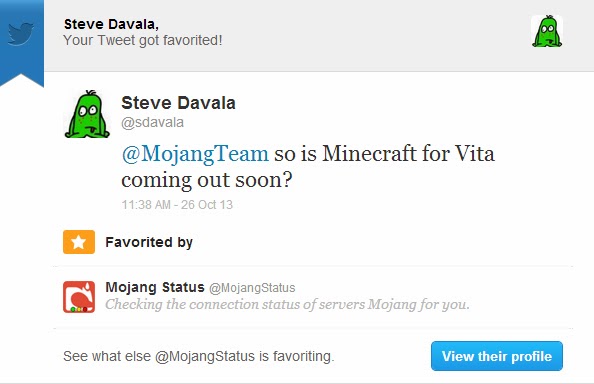 หลังจากที่ Sony ได้จีบ Markus Persson ผู้สร้างเกม Minecraft เป็นผลสำเร็จ ดึงเกมยอดนิยมมาลงให้กับเครื่อง PlayStation 4, PlayStation 3 และ PS Vita ล่าสุดได้มีแฟนๆทวิตข้อความสอบถามไปยัง Mojang ว่าตัวเกมจะมีกำหนดวางจำหน่ายบนเครื่อง PS Vita เร็วๆนี้หรือไม่ แต่ทาง Mojang ไม่ได้ตอบกลับมาแต่อย่างใดเพียงแต่กด “favorite” ข้อความเอาไว้ คาดว่าชาววีต้าอาจจะได้สัมผัสเกม Minecraft เร็วๆนี้ก็เป็นได้