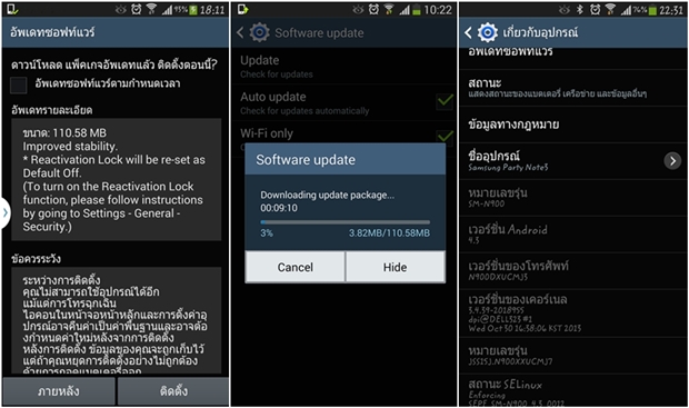 Samsung ประเทศไทยได้ปล่อยอัพเดท Software แก้ไขบัคให้กับ Galaxy Note 3 (SM-N900) รุ่นที่จำหน่ายในประเทศไทยแล้ว ซึ่งสามารถอัพเดทผ่าน OTA ทาง Wifi ได้ด้วยตัวเองโดยไปที่ settings > about device >software update ตัวไฟล์มีขนาด 110.58 MB