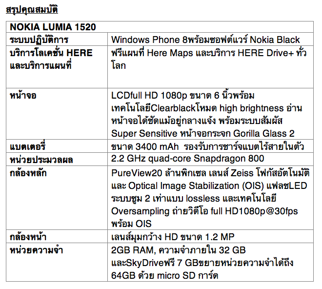 โนเกียเตรียมวางจำหน่าย Nokia Lumia 1520 สมาร์ทแฟบเล็ตเครื่องแรกของโนเกีย มาพร้อม Nokia Black ซอฟต์แวร์ล่าสุดสำหรับ Windows Phoneสมบูรณ์แบบทั้งเพื่อความบันเทิงและการทำงานด้วยหน่วยประมวลผล Quad-Core Snapdragon และหน้าจอ full HD ขนาด6 นิ้วมองเห็นหน้าจอได้ชัดแม้อยู่กลางแจ้ง เพิ่มความง่ายในการใช้งาน ตื่นเต้นเต็มตาทุกความบันเทิง