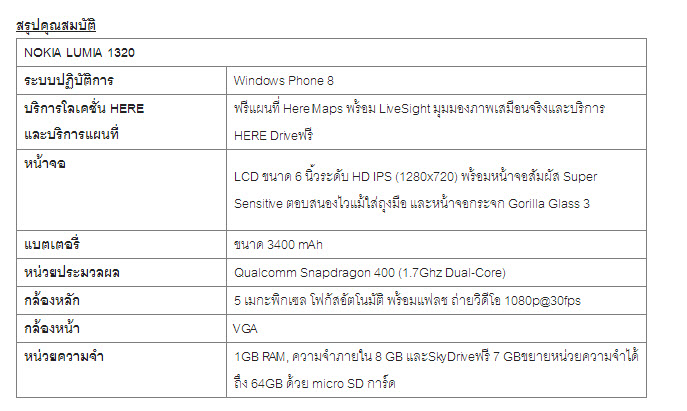 โนเกียคึกคักรับปีม้าลุยตลาดสมาร์ทแฟบเล็ต ส่ง Nokia Lumia 1320 สมาร์ทโฟนหน้าจอ HD 6 นิ้วราคาย่อมเยาแต่เปี่ยมด้วยเทคโนโลยีระดับไฮเอนด์ ทั้งนวัตกรรมถ่ายภาพล่าสุด เช่น Nokia Camera และ Nokia Storyteller บริการแผนที่นำทาง HERE และฟังเพลงโดยไม่มีโฆษณากับ Nokia MixRadio เต็มที่กับการทำงานได้อย่างมีประสิทธิภาพกับ Microsoft Office และสนุก สะใจ เต็มอารมณ์กับทุกความบันเทิง