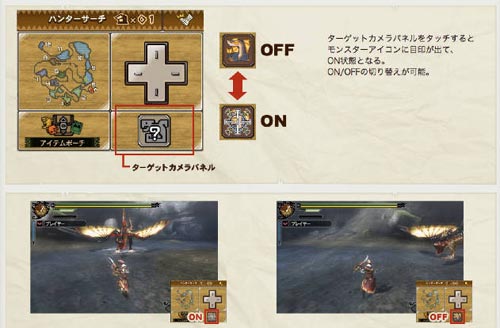 ระบบล็อคเป้าหมายนี้เรียกว่าระบบ “Target Camera” ที่จะอยู่ในเมนูหน้าจอทัชสกรีน สามารถปิด/เปิด โดยการ จิ้ม!! โดยปกติหากกด L มันจะเป็นการรีเซ็ตมุมกล้องไปด้านหน้าตัวละคร แต่หากคุณเปิดใช้งาน “Target Camera” เมื่อกด L แล้วมันกดหันไปหามอนสเตอร์บอสเควสต์นั้นๆแทน ถ้าตอนที่ฉากนั้นๆไม่มีบอส มันก็จะขึ้นเครื่องหมาย ? แทน ก็คือยังเปิดใช้งานไม่ได้