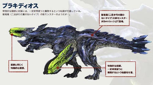 มอนสเตอร์ตัวใหม่ที่ไม่ทราบว่าเป็นญาติส่วนไหนของ Barroth เพราะว่าหน้าตาคล้ายๆกัน เจ้าบลาคิดิออสนี้จะใช้หัวและและท่อนแขนที่แข็งเป็นอาวุธ แถมมันยังมีแร่ดินระเบิดติดไว้ด้วย เมื่อมันใช้หัวหรือท่อนแขนโจมตี แร่ระเบิดพวกนั้นจะเกิดระเบิดขึ้นมา เมื่อเวลาผ่านไประยะหนึ่ง