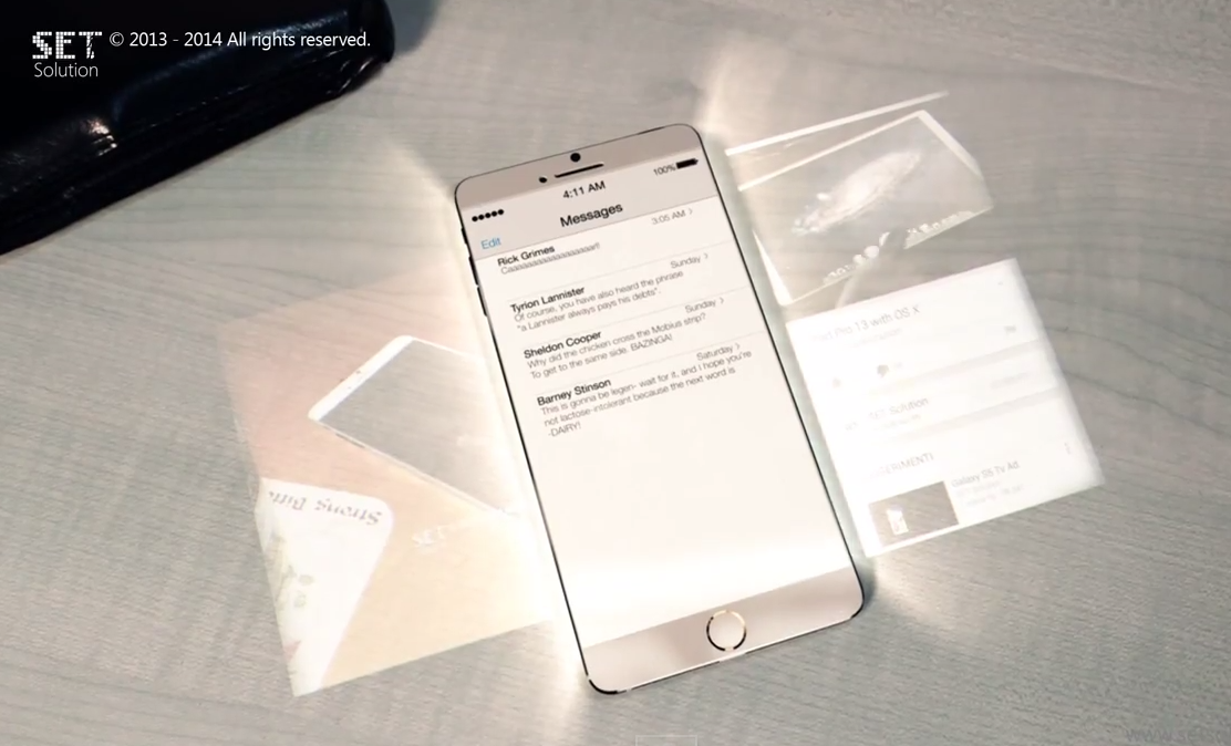 กลับมาอีกครั้งกับคอนเซป iPhone 6 จากทาง SET Solution ที่ได้เจิดไอเดียความสามารถใหม่ของ iPhone 6 ทั้งการใช้งานได้พร้อมกัน 3 หน้าจอด้วยการฉายภาพโปรเจคเตอร์ รวมไปถึงการเล่นเกมแบบ 3D และชมภาพยนตร์แนวตั้งด้วยการฉายภาพแบบ Holographic ขึ้นมา นอกจากนี้ยังมีการแจ้งเตือนที่ปุ่ม Touch ID เมื่อกดแล้วจะแสดงแอพที่แจ้งเตือนขึ้นมาทันที นอกจากนี้ยังสามารถจดโน็ตไปยัง iPhone 6 ด้วยการฉายแสงลงมาให้เขียนอีกด้วย ล้ำสุดๆ แต่เกรงว่าทำออกมาจริงจะซดแบตเตอร์รี่ขนาดไหน 🙂