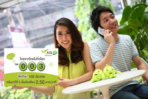 เอไอเอส 3G 2100 ผู้ให้บริการโทรจากไทยไปต่างประเทศผ่านรหัส 003 ใน 240 ประเทศทั่วโลก ให้ลูกค้าประหยัดยิ่งขึ้น ด้วยโปรโมชั่นใหม่สุดคุ้ม “003 ยิ่งคุยนาน ยิ่งประหยัด” เพียงโทรผ่านรหัส 003 ที่มีคุณภาพสัญญาณเสียงชัดใส ต่อติดง่าย ไปยัง 100 ประเทศปลายทางยอดนิยมทั่วโลก อาทิ สหรัฐอเมริกา , จีน , แคนนาดา , สิงคโปร์ , ฮ่องกง , พม่า , ลาว และมาเลเซีย เป็นต้น ด้วยอัตราค่าบริการเริ่มต้นแค่นาทีละ 3 บาท และหลังจากนาทีที่ 3 เริ่มต้นเพียงนาทีละ 2.50 บาท ตั้งแต่วันนี้ – 31 พฤษภาคม 2557 สอบถามรายละเอียดเพิ่มเติมได้ที่ เอไอเอส คอลล์ เซ็นเตอร์ 1175 หรือดูรายละเอียดได้ทาง www.ais.co.th/003