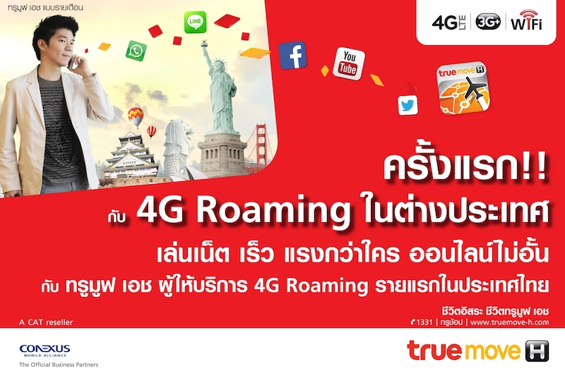 และนักท่องเที่ยวชาวต่างชาติที่เดินทางมาเที่ยวเมืองไทย สามารถใช้บริการได้อย่างต่อเนื่องแม้อยู่ต่างแดน ล่าสุด ทรูมูฟ เอช ตอกย้ำความเป็นผู้นำบริการ 4G LTE ด้วยการขยายเครือข่าย 4G LTE ในไทย อีกทั้งยังเป็นผู้ให้บริการรายแรกที่เปิดให้บริการ 4G LTE ดาต้า โรมมิ่ง ประเดิมจับมือกับโอเปอเรเตอร์พันธมิตรชั้นนำ เปิดให้บริการแล้วบนเครือข่าย KT Korea ประเทศเกาหลี และเตรียมเปิดให้บริการบนเครือข่าย NTT Docomo ประเทศญี่ปุ่นในเร็วๆ นี้ ซึ่งทั้งสองประเทศเป็นจุดหมายปลายทางยอดนิยมของคนไทย พร้อมเดินหน้าแผนเปิดบริการ 4G LTE ดาต้า โรมมิ่งให้ครอบคลุม 10 จุดหมายปลายทางภายในปีนี้ อาทิ สิงคโปร์ สหรัฐอเมริกา ฮ่องกง ไต้หวัน ฟิลิปปินส์ รัสเซีย นิวซีแลนด์ และมาเลเซีย”