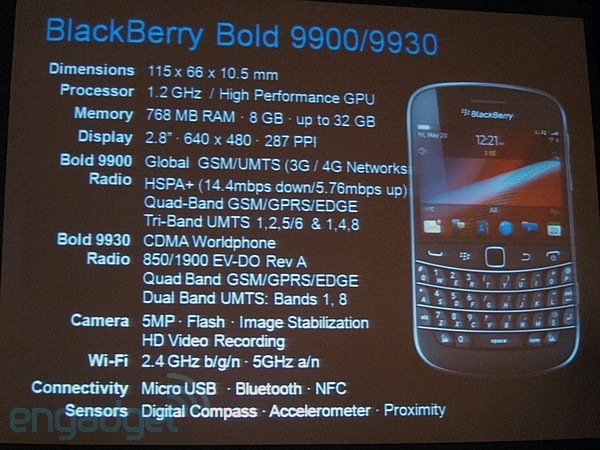 หลังจากรอคอยติดตามข่าวของ BlackBerry รุ่นใหม่จากทางRIM กันมาสักระยะหนึ่งแล้ว ในที่สุดก็ถึงเวลาที่ทาง RIM ได้ออกมาเปิดตัว BlackBerry รุ่นใหม่ล่าสุดกันเสียที การเปิดตัวดังกล่าวนี้เกิดขึ้นในงาน BlackBerry World Conference ที่รัฐ Orlando อเมริกา ไปสดๆร้อนๆซึ่งได้เปิดตัวอย่างเป็นทางการทั้งหมด 2 รุ่นด้วยกันได้แก่ BlackBerry Bold 9900 และ 9930 โดยทั้งสองรุ่นนี้มาพร้อมกับคุณสมบัติ 1.2GHz Snapdragon processor , หน้าจอระบบสัมผัส ขนาด 2.8 นิ้ว VGA ความละเอียดหน้าจอ 287dpi pixel ,กล้องดิจิตอลความละเอียด 5 ล้านพิกเซล ,ถ่าย VDO ได้ในระดับ 720p HD หน่วยความจำภายในตัวเครื่อง 8GB พร้อมรองรับ microSD card , รองรับระบบ NFC circuitry, มีความบางของตัวเครื่องเพียง 10.5mm ซึ่งถือได้ว่าเป็นรุ่นที่มีความบางมากที่สุดเท่าที่เคยผลิตในปัจจุบัน , ตัวเครื่องทำจากวัสดุ stainless steel และfiberglass , แป้นพิมพ์แบบ full QWERTY keyboard , Bluetooth 2.1 และระบบปฏิบัติการ BlackBerry 7 OS. ซึ่งมีคุณสมบัติในการใช้งานที่มีประสิทธิภาพมากยิ่งขึ้น ส่วนสิ่งที่แตกต่างกันของทั้งสองรุ่นนี้ก็คือ 9900 รองรับการใช้งาน 3G และ 4G ได้ ในขณะที่ 9930 รองรับการใช้งานได้ทั้งกับระบบ CDMA กำหนดการในการวางจำหน่ายคาดว่าน่าจะเป็นช่วงฤดูร้อนปีนี้