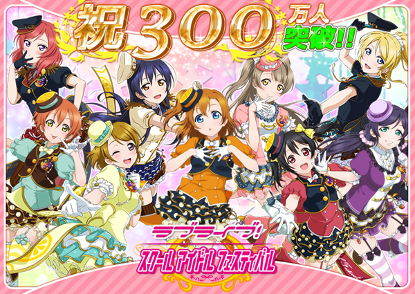 School idol festival เกมแนวกดปุ่มตามจังหวะเพลงบน iPhone ,iPad และ Android ที่ฮิตจัดมาจากประเทศญี่ปุ่นที่เปิดให้เล่นกันตั้งแต่เดือนเมษายนปีที่แล้ว และเวอร์ชั่นภาษาอังกฤษให้ดาวน์โหลดไปเล่นกันแล้วอีกด้วย โดยต้นสังกัดได้เผยว่ามียอดผู้เล่นทะลุกว่า 3,000,000 คนเป็นเรียบร้อยแล้วหลังจากที่เพิ่งฉลองยอดผู้เล่นทะลุ 2,000,000 คนไปเมื่อเดือนกุมภาพันธ์ที่ผ่านมา ใครชอบเกมแนวนี้สามารดาวน์ไปเล่นได้ฟรีที่ลิงค์ด้านล่าง