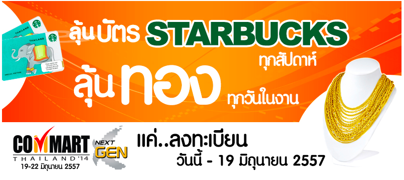 อัพเดทข่าวสารดีๆจากงาน Commart Thailand 2014 เพียงลงทะเบียนออนไลน์เข้าร่วมงานตั้งแต่วันนี้ – 19 มิ.ย. 2557 ลุ้นรับบัตร Starbucks ฟรีจำนวน 500 ใบ (บัตรมีมูลค่าใบละ 200 บาท) โดยจะจับรางวัลบัตร Starbucks ครั้งละ 100 ใบ จำนวน 5 ครั้ง รวม 500 ใบ ดังนี้