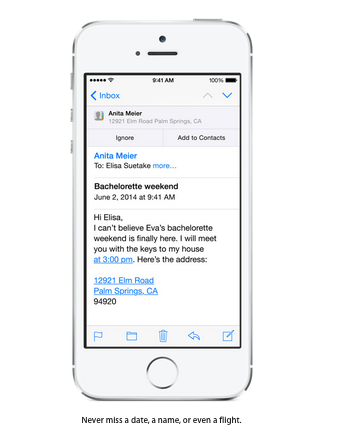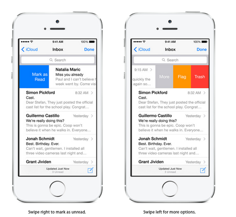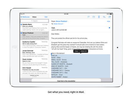 ส่วนของการใช้งาน Mail ได้เพิ่มความสะดวกและรวดเร็วในการใช้งานมากยิ่งขึ้น โดยจะสามารถสลับไปมาระหว่างจดหมายที่กำลังเขียนอยู่ กับจดหมายที่ส่งมาใน Inbox ได้สะดวกและรวดเร็วขึ้น รวมไปถึงยังสามารถนำข้อมูลจาก email ไปบันทึกไว้ที่ Calendar หรือ Contacts ได้อีกด้วย และยังสามารถเลื่อนเพื่อจัดกลุ่มสถานะจดหมายใน Inbox ด้วยการ swipe