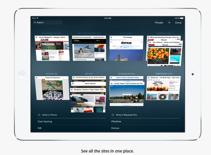 Safari บน iPad สำหรับ iOS 8 นั้นได้มีการปรับปรุงประสิทธิภาพการใช้งานให้ดียิ่งขึ้น โดยจะสามารถมองเห็นหน้าเว็บไซต์ที่เปิดไว้ทั้งหมดได้ในหน้าจอเดียว และยังสามารถเลื่อน Sidebar ขึ้นมาเพื่อดูส่วนของ Bookmarks ที่เคยบันทึกไว้ หรือแชร์ Link ที่กำลังดูอยู่ได้