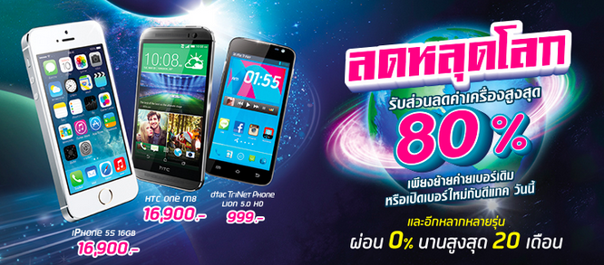 จัดมาลดราคากันอีกครั้งกับ โปรลดหลุดโลก จาก dtac โดยลูกค้าที่ย้ายค่าย เปิดเบอร์ใหม่ หรือเปลี่ยนมาใช้ระบบรายเดือน dtac TriNet วันนี้ รับส่วนลดค่าเครื่องสูงสุด 80% ยกขบวนสมาร์ทโฟนรุ่นยอดนิยมจากดีแทค พร้อมดีลสุดคุ้ม ผ่อน 0% นานสูงสุดถึง 20 เดือน วันนี้ – 30 มิ.ย. 57 เท่านั้น
