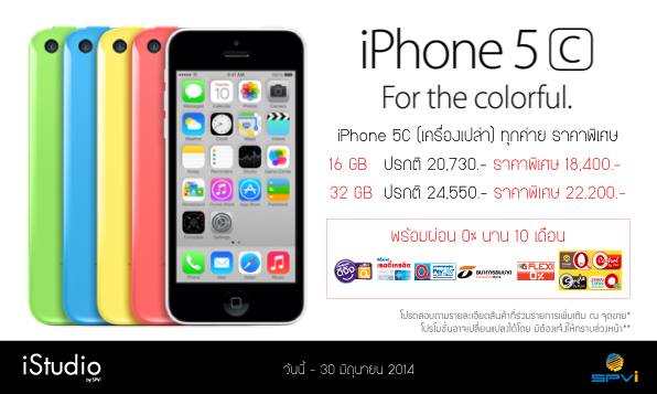 iStudio by SPVi จัดโปรลดราคา iPhone 5C เครื่องเปล่าทุกค่าย ราคาพิเศษในรุ่น 16GB ราคาปกติ 20,730 บาทราคาพิเศษ 18,400 บาท ความจุ 32GB ราคาปกติ 24,550 บาทราคาพิเศษ 22,200 บาท ผ่อน 0% นาน 10 เดือน เริ่มตั้งแต่วันนี้ถึง 30 มิถุนายน นี้เท่านั้น สามารถเป็นเจ้าได้ที่ iStudio และ iBeat ที่ร่วมรายการดังนี้