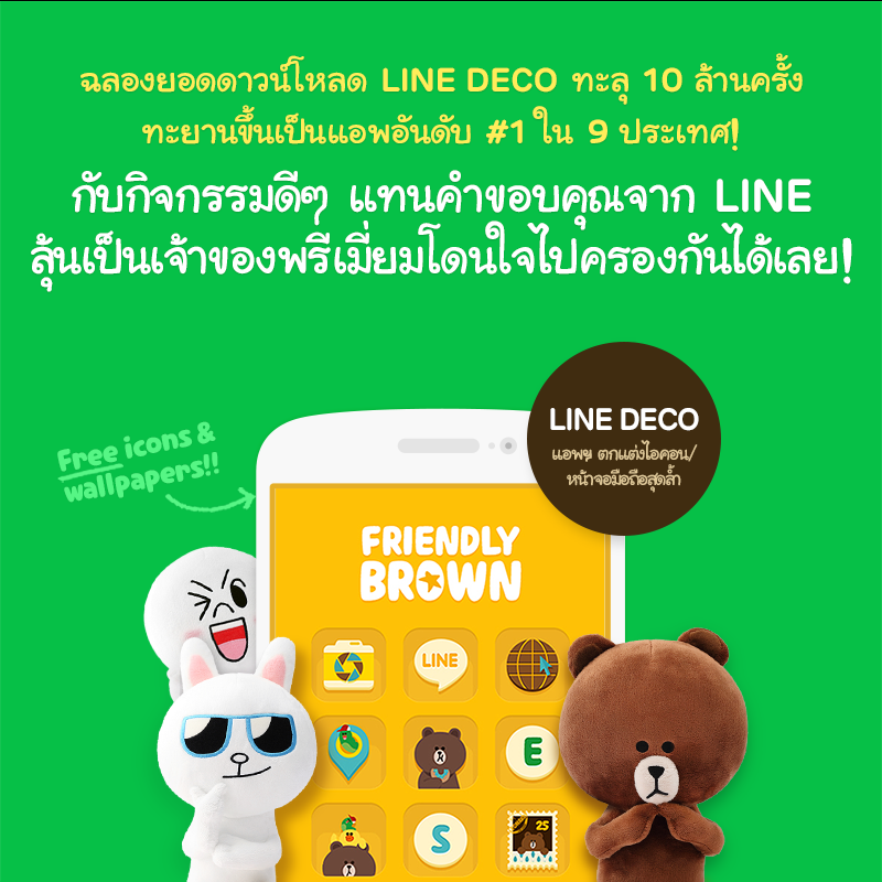 รายละเอียดเพิ่มเติมดูได้ที่ LINE DECO แอพพลิเคชั่น คลิกด้านบนซ้าย > Notice > Thank you event for 10 million breakthroughs