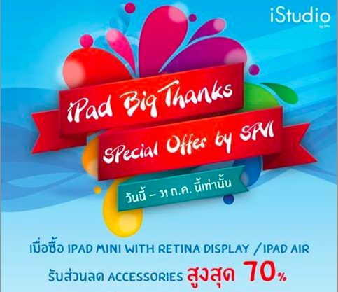 รับส่วนลดค่าเครื่องทันที 1,000บาท*** และยังผ่อนเบาๆ 0% นานสูงสุด 10เดือน พร้อมรับเครดิตเงินคืน 500 บาทจากบัตรเครดิตกรุงศรี และรับสิทธิพิเศษต่างๆอาทิเช่น รับสิทธิ์ซื้อAccessories ในส่วนลดสูงสุดถึง>>70% พร้อมส่วนลดในการซื้อ Apple care for iPad 15% และอื่นๆอีกมากมาย ที่ iStudio,iBeat by SPVi ทุกสาขา