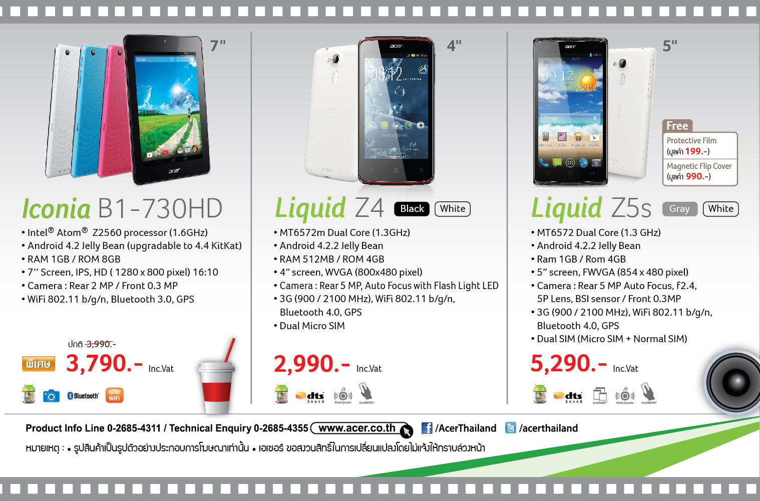 เอเซอร์ เปิดตัวสมาร์ทโฟนรุ่นใหม่ Acer Liquid Z5s พร้อมทำตลาดในประเทศไทยอย่างเป็นทางการ มากับค่าตัว 5,290 บาท สำหรับลูกค้าที่จับจองเป็นเจ้าของภายในเดือนสิงหาคมนี้ รับฟรี! ฟิล์มกันรอย และ เคส Magnetic Flip Cover มูลค่า 990 บาท นอกจากนี้ เอเซอร์ ยังจัดโปรโมชั่นแท็บเล็ต และ สมาร์ทโฟน รุ่นใหม่ๆ ในราคาที่เป็นเจ้าของได้ง่ายๆ ตั้งแต่วันนี้ ไปจนถึง 31 สิงหาคม 2557