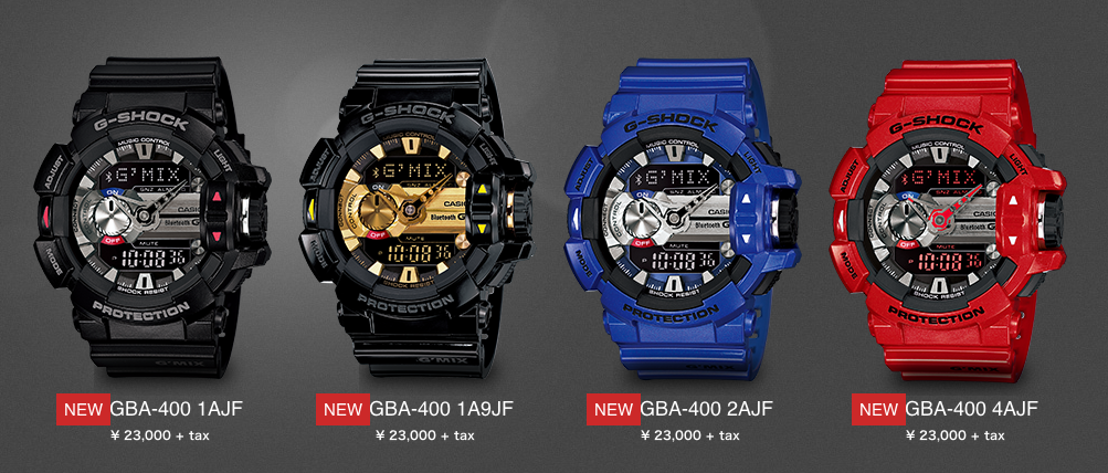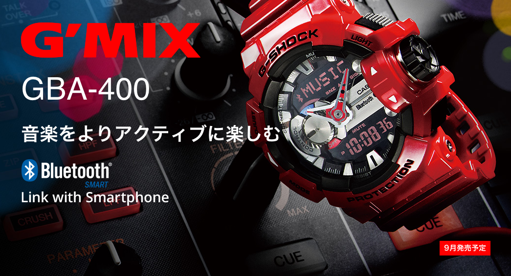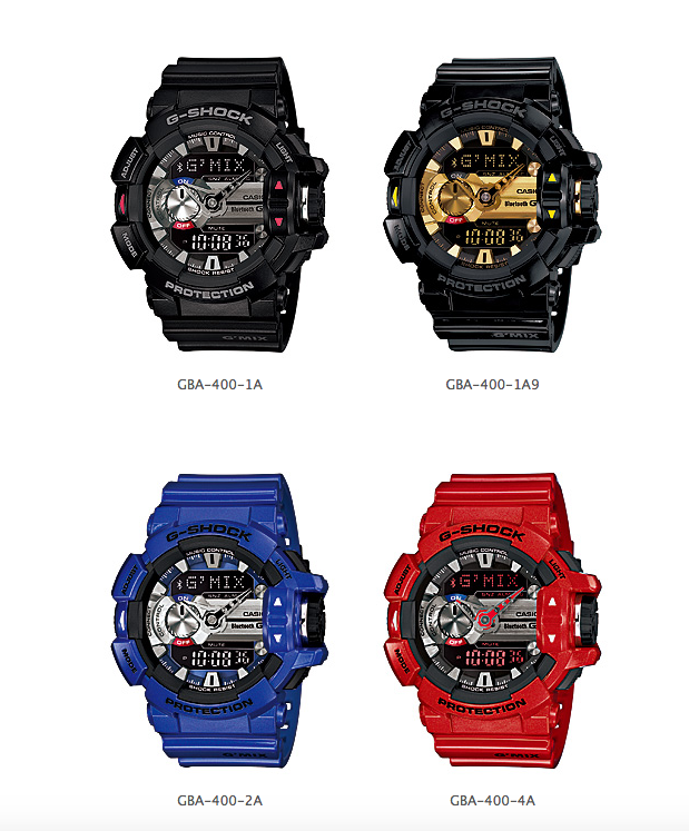 Casio เปิดตัว G-Shock รุ่น GBA-400 ที่สามารถแสดงรายชื่อเพลงที่กำลังฟังจากบน iPhone หรือ Android มาปรากฎที่หน้าปัดนาฬิกาได้ด้วยแอพ G’MIX ในการเชื่อมต่อสมาร์ทโฟนกับตัวนาฬิกาผ่านทาง Bluetooth สามารถแสดงสายเรียกเข้า ข้อความจากสมาร์ทโฟนมาที่นาฬิกาได้ ปรับแต่งเวลาจากแอพบนสมาร์ทโฟนได้ง่ายๆ และสามารถควมคุมเพลงหรือค้นหาเพลงผ่านเทคโนโลยี SoundHound ได้อีกด้วย