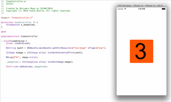 จากการทดสอบก็พบว่าเมื่อมีตัวเลือกให้เลือกทั้ง 1x, 2x, 3x image asset code ที่เขียนลงไปนั้นก็เลือกใช้ 3x asset เสมอถึงแม้ว่าจะเลือก image asset ที่ตรงกับความละเอียดหน้าจอของรุ่นปัจจุบันก็ตาม โดยที่ image asset ต่างๆนั้นเป็นตัวเลือกของการเลือกขนาดของภาพที่จะแสดงผลบน iOS ซึ่งจาก iOS simulator ที่เลือกภาพแบบ 3x เสมอก็อาจจะได้ข้อบ่งชี้ความละเอียดหน้าจอใน iPhone 6 ที่กำลังจะเปิดตัวจะมีความละเอียดที่สูงขึ้น