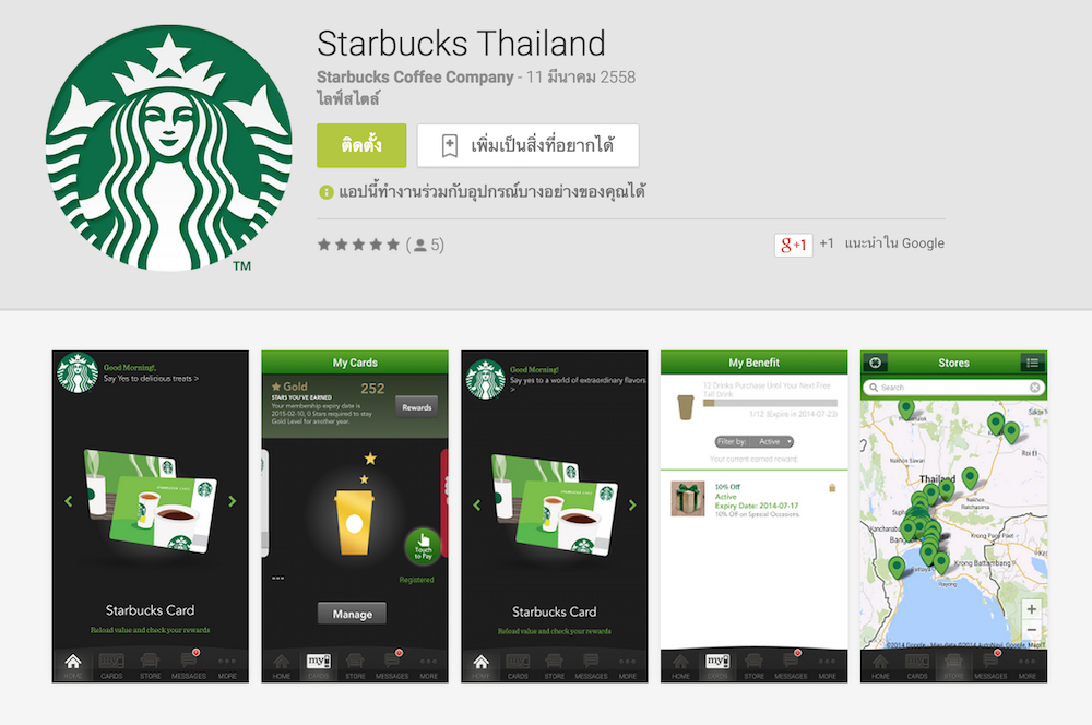 วันนี้ Starbucks ประเทศไทยได้เปิดตัวแอพทางการบน iPhone และ Android ให้ผู้ที่ถือบัตร Starbucks Cards ในประเทศไทยได้ใช้ซื้อเครื่องดื่มหรือซื้อสินค้าในร้านผ่านทางสมาร์ทโฟนแทนบัตร Starbucks Cards ได้แล้ววันนี้ แถมยังบอกคะแนนสะสม My Starbucks Rewards โปรโมชั่นใหม่ๆ รายละเอียดเครื่องดื่ม อาการ เมล็ดกาแฟ สินค้าภายในร้าน และยังมีเมนูบอกที่ตั้งร้าน Starbucks ในบริเวณใกล้เคียง หรือจะค้นหาสาขาทั่วประเทศก็สามารถทำได้ เมนูการใช้งานก็รองรับภาษาไทยอีกด้วย