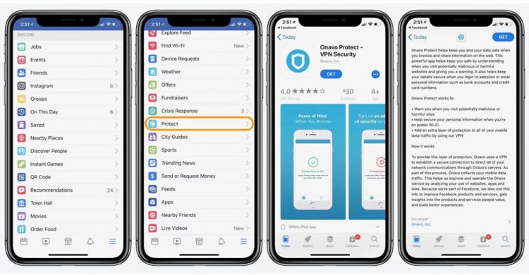 แอพพลิเคชั่น Facebook สำหรับอุปกรณ์ iOS เริ่มแนะนำฟีเจอร์ใหม่ที่เรียกว่า Protect แต่เมื่อแตะเข้าไปแล้ว จะนำทางไปยังการดาวน์โหลดแอพพลิเคชั่น Onavo Protect – VPN Security ใน App Store และสามารถติดตั้งใช้งานได้ฟรี!! โดยมีคำอธิบายว่า Onavo Protect จะช่วยเพิ่มความปลอดภัยให้กับข้อมูลของผู้ใช้งาน เมื่อมีการท่องเว็บหรือแชร์ข้อมูลบนเว็บไซต์ต่างๆ และแจ้งเตือนเมื่อมีการเข้าเว็บไซต์ที่มีมัลแวร์