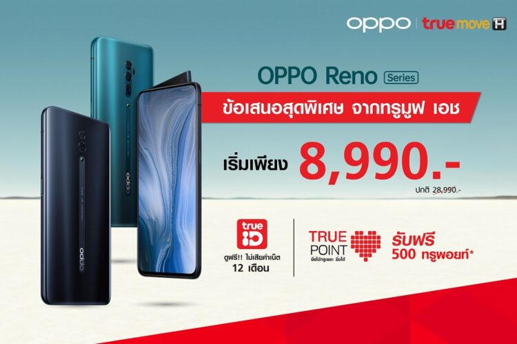และขอเสนอสุดพิเศษจากทรูมูฟ เอช สำหรับลูกค้าที่จอง OPPO Reno 10x Zoom ด้วยราคาเริ่มต้นเพียง 8,990 บาท จากปกติ 28,990 บาท เมื่อสมัครแพ็กเกจรายเดือน 4G+ Extra FUN Unlimited 1,899 บาท โดยชำระค่าบริการล่วงหน้า 10,000 บาท รับส่วนลดค่าบริการรายเดือน 1,000 บาท/เดือน นาน 10 เดือน และเน็ต 4G ไม่อั้นไม่ลดสปีด พร้อมสิทธิ True ID ให้คุณเพลิดเพลินไปกับความบันเทิงแบบ HD นาน 12 เดือน ไปเลยฟรีๆ! นอกจากนี้เมื่อซื้อ OPPO Reno 10x Zoom พร้อมสมัครแพ็กเกจ รับไปเลย 500 ทรูพอยท์ (ปกติทุก 100 บาท รับ 1 ทรูพอยท์)