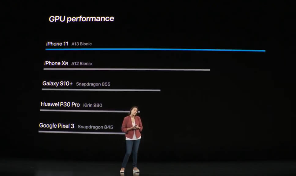 iPhone 11 ได้รับชิปรุ่นใหม่ A13 Bionic ซึ่งชัดเจนว่ามีประสิทธิภาพดีกว่าคู่แข่ง เพราะแม้แต่ชิปรุ่นเก่า A12 ก็ยังแรงกว่า ขณะที่แบตเตอรี่อยู่นานกว่าเดิม 1 ชั่วโมง เมื่อเทียบกับ iPhone XR