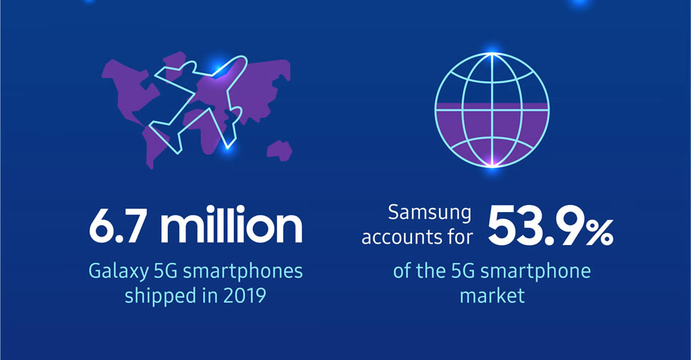 Samsung ประกาศความเป็นผู้นำในตลาดสมาร์ทโฟน 5G ด้วยยอดจัดส่ง 6.7 ล้านเครื่องในปีที่ผ่านมา และครองส่วนแบ่งในตลาดสมาร์ทโฟน 5G เกินครึ่ง (53.9%) อ้างอิงข้อมูลจาก Counterpoint Research ที่บันทึกในระหว่างเดือนเดือนมกราคม – พฤศจิกายน 2019