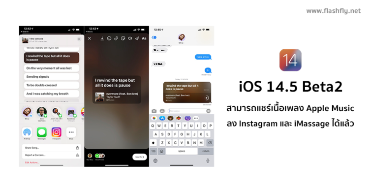 ฟีเจอร์ใหม่บน iOS 14.5 Beta 2 นี้จะทำให้ผู้ใช้งาน Apple Music สามารถเลือกเนื้อเพลงบางท่อนหรือหลายท่อนและกดแชร์ลงใน Instagram หรือ iMassage ได้โดยคนที่ได้รับจะสามารถกดฟังท่อนที่ได้ส่งไปได้อีกด้วย