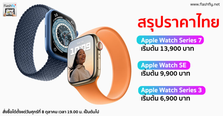 - ราคาของ Apple Watch Series 7 เริ่มต้นที่ 13,900 บาท, Apple Watch SE เริ่มต้นที่ 9,900 บาท, และ Apple Watch Series 3 เริ่มต้นที่ 6,900 บาท