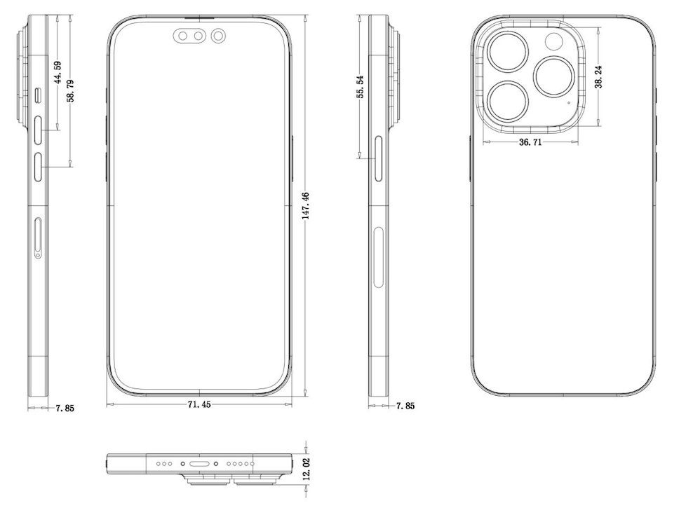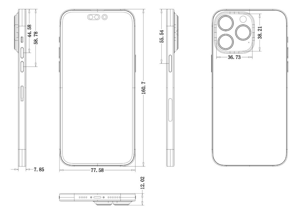 แผนผังการออกแบบ iPhone 14 Pro เผยให้เห็นมิติตัวเครื่องทั้งหมด รวมถึงการเปลี่ยนแปลงของรอยบาก