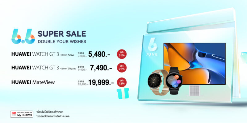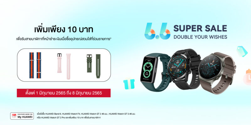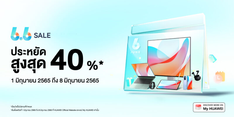 หัวเว่ย คอนซูมเมอร์ บิสสิเนส กรุ๊ป (ประเทศไทย) จัดมหกรรมแคมเปญชอปปิงออนไลน์สุดยิ่งใหญ่ต้อนรับกลางปี ส่งดีลปัง HUAWEI 6.6 Sales ยกทัพสมาร์ทดีไวซ์สุดล้ำหลากหลายกลุ่มผลิตภัณฑ์ไม่ว่าจะเป็นแท็บเล็ต สมาร์ทวอทช์ และจอมอนิเตอร์ มาให้เลือกจับจองเป็นเจ้าของในราคาลดพิเศษสูงสุดถึง 40% พร้อมยกกำลังความคุ้มค่า แค่จ่ายเพิ่มเพียง 10 บาท รับสายนาฬิกาเพิ่มไปเลย เมื่อซื้อสมาร์ทวอทช์รุ่นที่ร่วมรายการ จำกัดเวลาร่วมโปรเด็ดโดนใจแบบไม่กลัวฝนตั้งแต่วันที่1 มิถุนายน 2565 ถึงวันที่ 8 มิถุนายน 2565 เมื่อซื้อสินค้าผ่านช่องทาง HUAWEI Store และร้านค้าอย่างเป็นทางการของหัวเว่ยบนแอปพลิเคชัน Lazada และ Shopee เท่านั้น