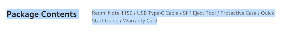 เว็บไซต์ทางการของ Mi ในอินเดีย ระบุว่า Redmi Note 11 SE จะจัดส่งมาพร้อมกับสายเคเบิล USB Type-C, เข็มช่วยถอดช่องใส่ซิมการ์ด, เคส, คู่มือ และ ใบรับประกัน โดยไม่ระบุถึง Power Adapter หรือ อุปกรณ์ชาร์จแบตเตอรี่