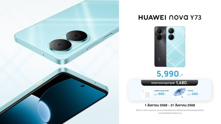 HUAWEI nova 73 วางจำหน่ายแล้ววันนี้ใน 2 สี ได้แก่ สีดำ และ สีฟ้า ในราคาเพียง 5,990 บาท พร้อมของแถมพิเศษเมื่อซื้อระหว่างวันที่ 1 สิงหาคม 2668 – 31 สิงหาคม 2668 ได้แก่